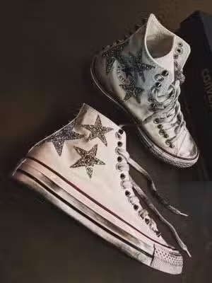 La classica Converse Chuck Taylor colore bianco alta rifinita con stelle in tessuto glitter argento, borchie su costola e tra occhielli e invecchiatura di suola e lacci Materiale tomaia: Canvas Suola: Fondo classico in gomma Borchie: Nickel FREE.