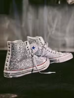 Rinnova il tuo look con La classica Converse Chuck Taylor alta rifinita con tessuto glitter colore argento su tomaia, borchie coniche argento ed effetto used di suola e lacci. Ideali per chi ama distinguersi.