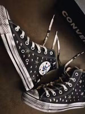 Rinnova il tuo look con Converse modello chuck taylor in pelle con suola classica, rifinita con borchie sferiche argento e stelle, effetto used di suola e lacci. Ideali per chi ama distinguersi.