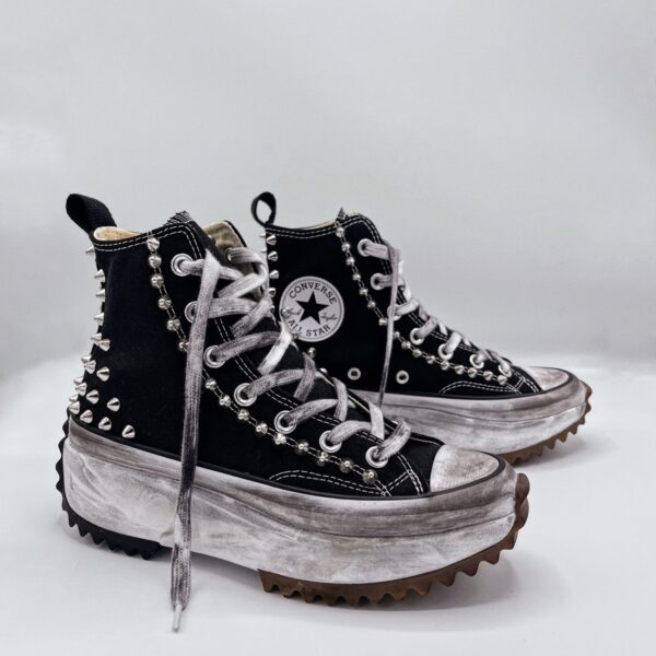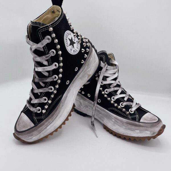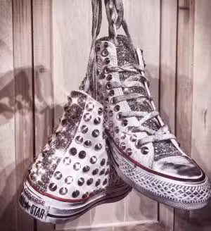 Converse alta classica con applicazione di borchie argento su tomaia e glitter argento su costola e linguetta.