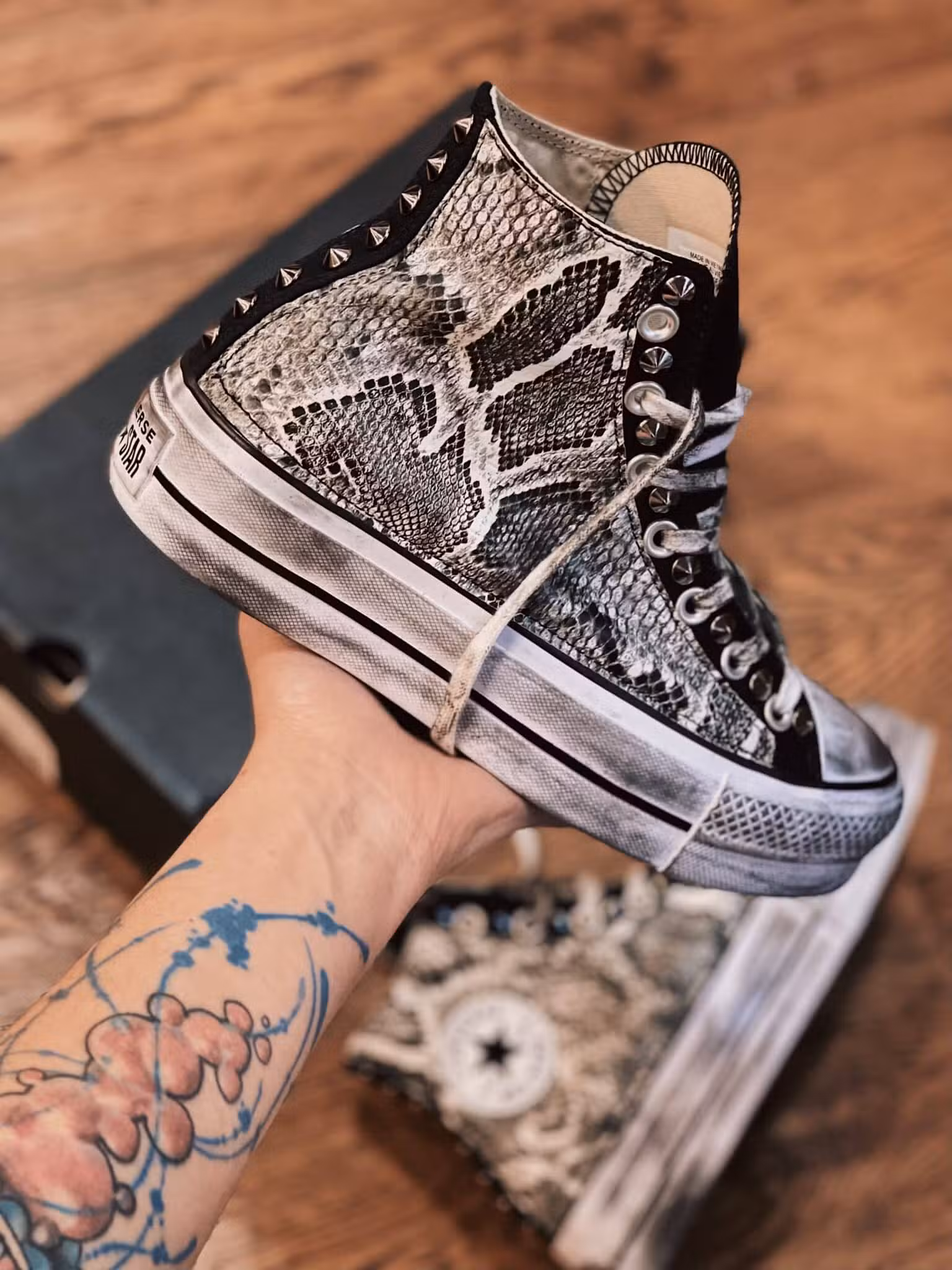 Converse modello platform alta, rifinita con pannelli in ecopelle effetto cobra bianco, borchie color canna di fucile ed invecchiatura di suola e lacci.