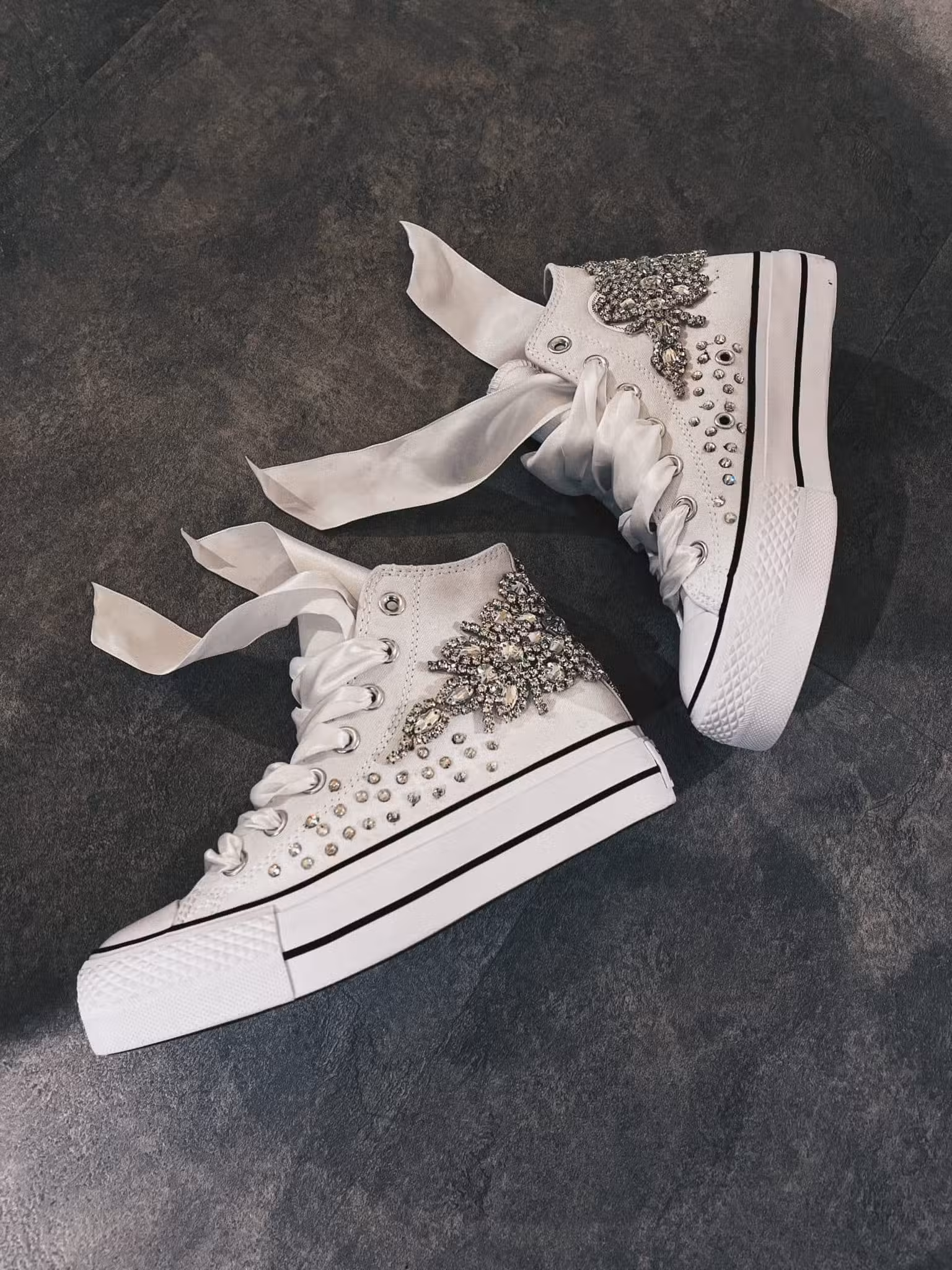 Converse modello alto suola platform, colore bianco con applicazione di cristalli strass su tomaia, gioiello sul collarino e lacci in raso Materiale: canvas Suola: platform Colore: Bianco Gioello: Argento.