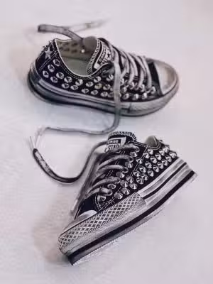 Rinnova il tuo look con Converse modello Chuck Taylor bass alla caviglia con suola PLATFORM EVA, rifinita con borchie coniche colore ARGENTO su tomaia ed effetto used su suola e lacci. Ideali per chi ama distinguersi.