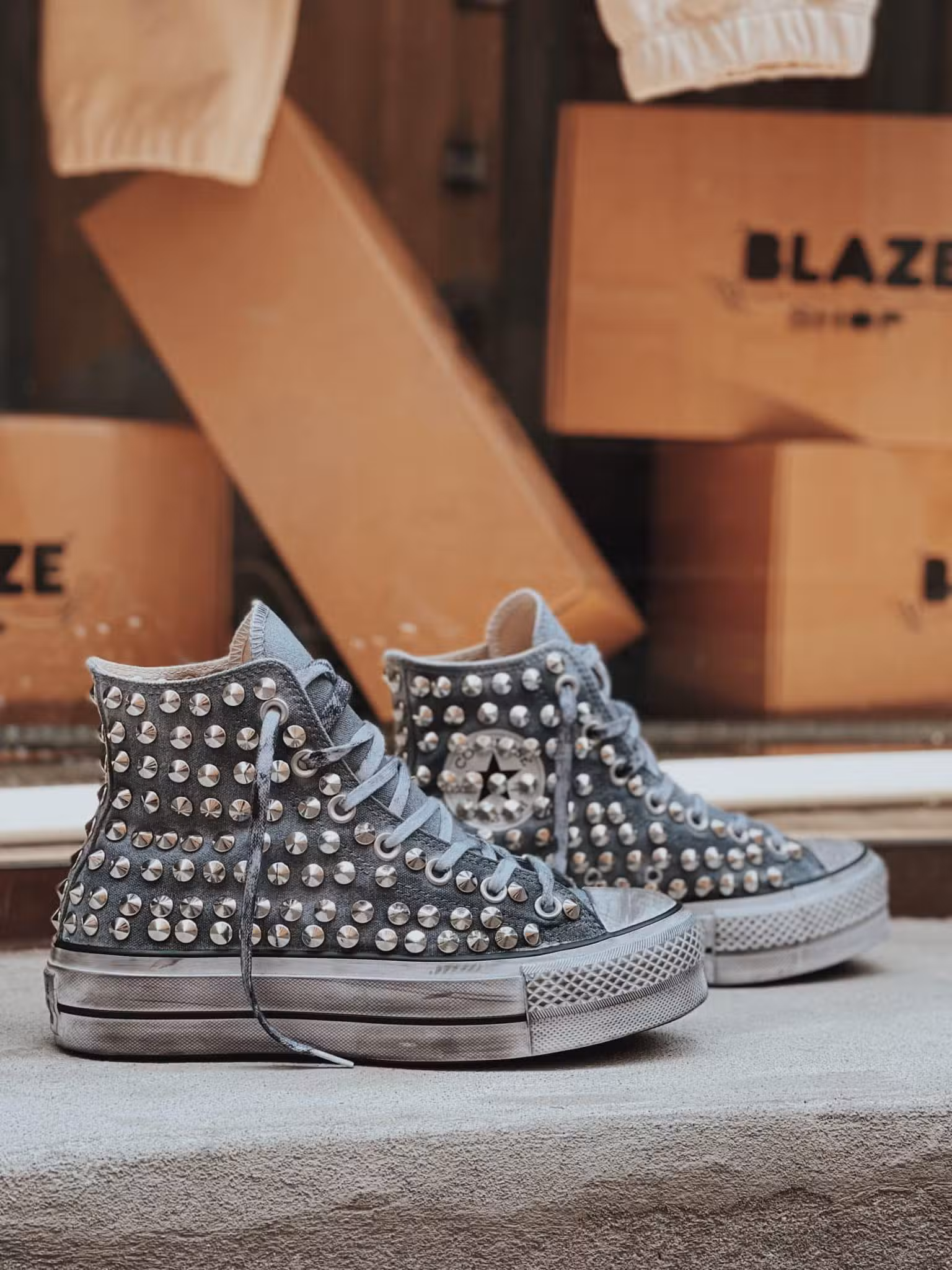 Le Converse Hi Platform Grey Full Borchie sono l’essenza dello stile grunge rivisitato in chiave fashion.