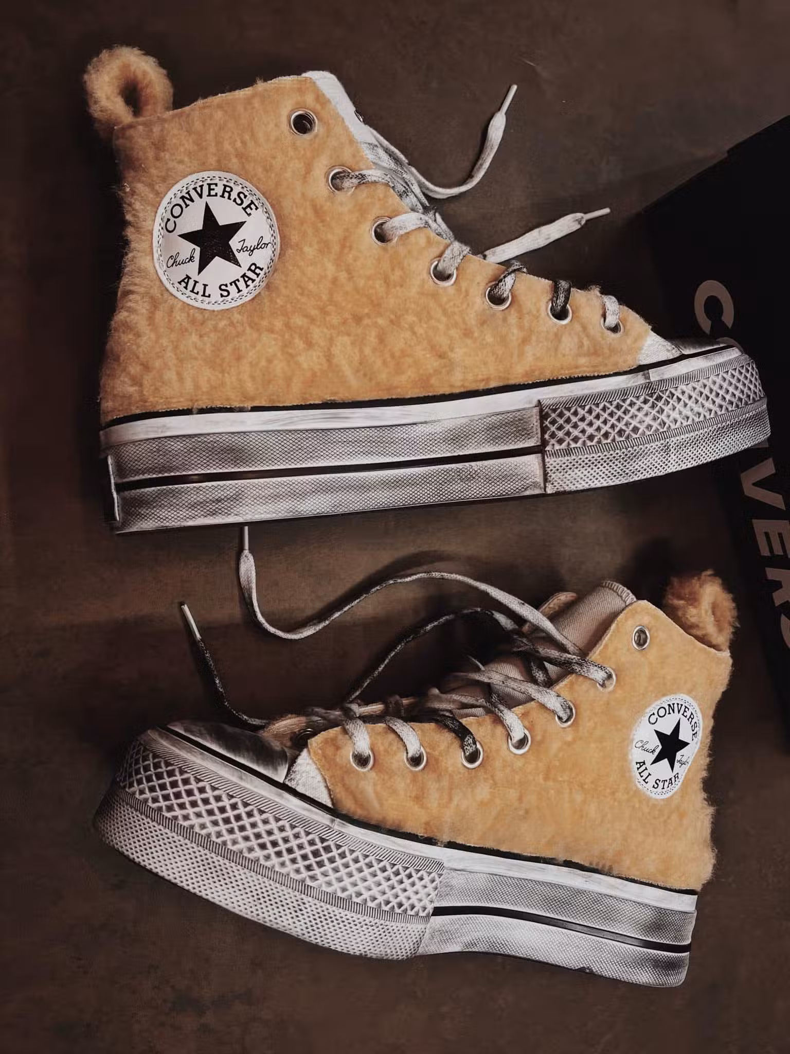 Converse modello platform alto colore bianco, rifinita con pannelli in tessuto TEDDY color crema, borchie coniche argento tra occhielli ed invecchiatura della suola.