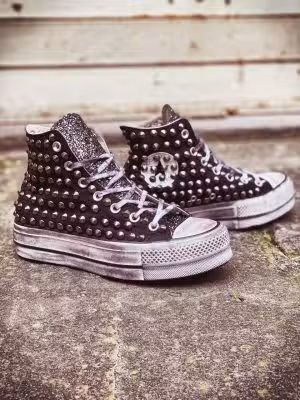 Converse modello PLATFORM alta alla caviglia rifinita con linguetta in glitter canna di fucile, borchie argento su tomaia ed invecchiatura di suola e lacci.