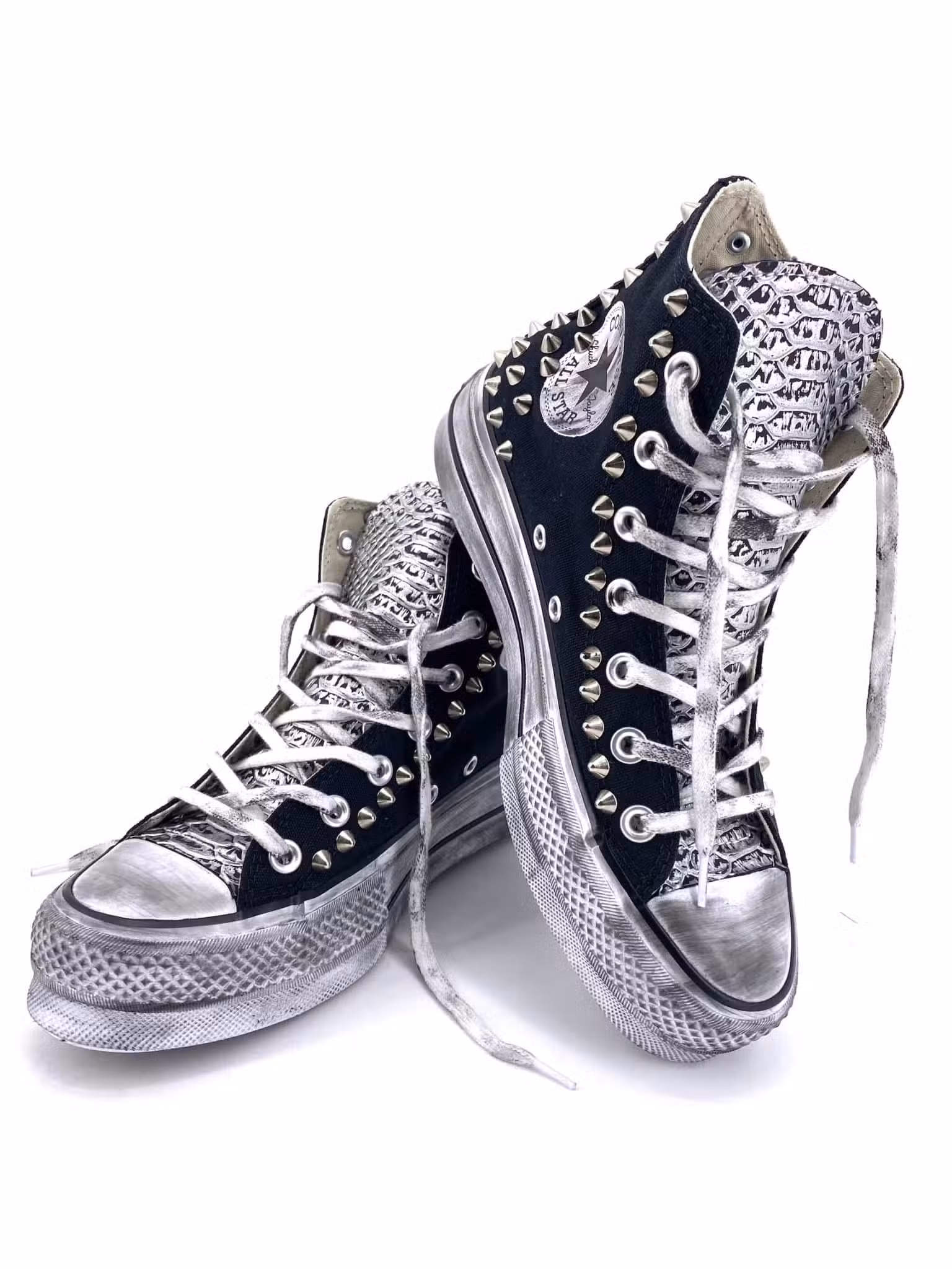 Converse modello PLATFORM alta colore nero rifinita con linguetta e costola pitone argento, borchie spikes su tallone e tomaia ed invecchiatura di borchie e lacci.