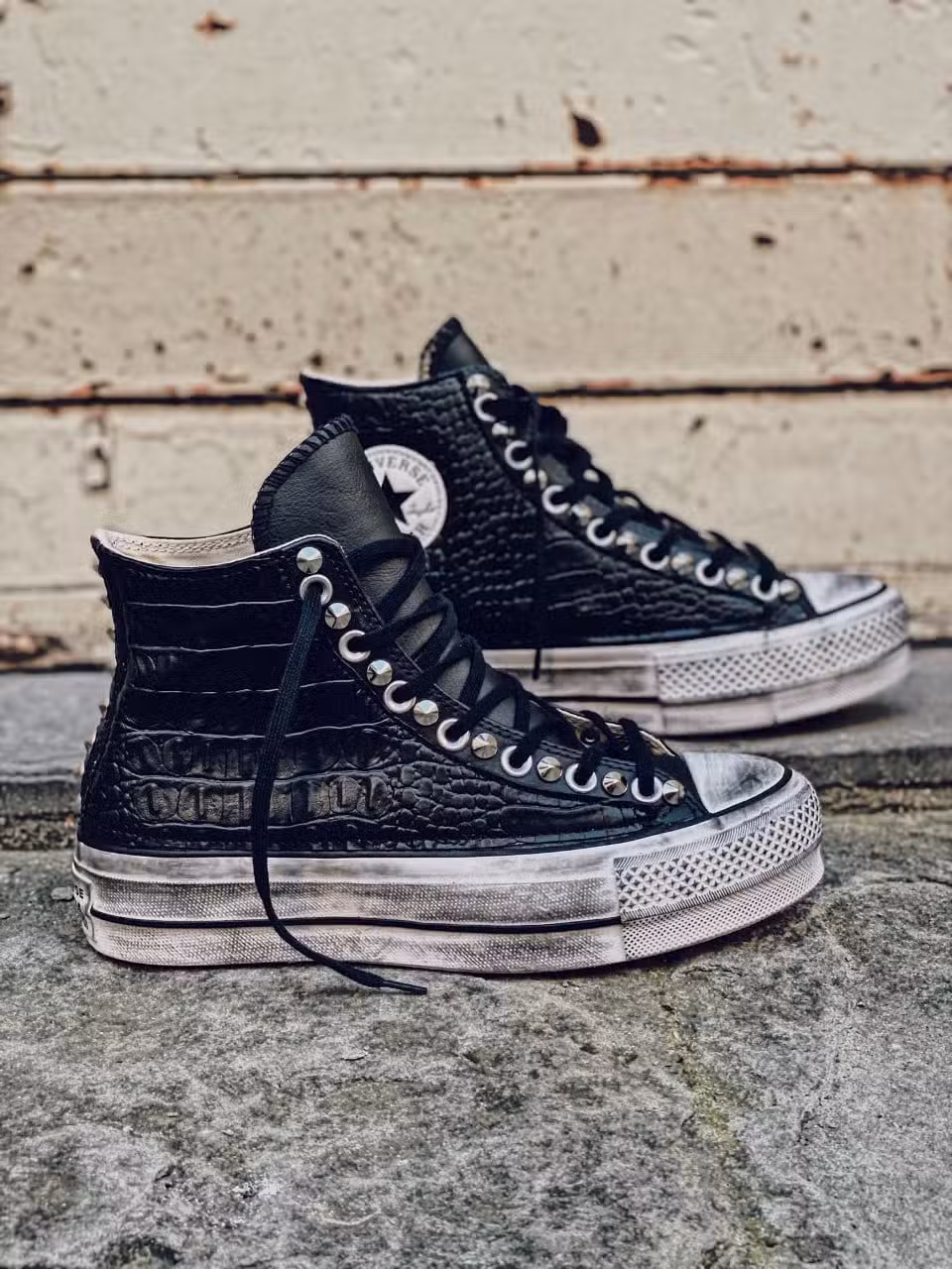 Converse modello PLATFORM colore nero in pelle, rifinita con pannelli in ecopelle stampa COCCODRILLO, borchie tra occhielli e su costola ed invecchiatura della suola.