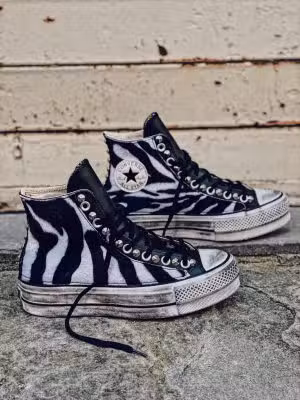 Rinnova il tuo look con Converse modello PLATFORM colore nero in pelle, rifinita con pannelli in ecopelle stampa cavallino effetto zebra, borchie tra occhielli e su costola ed invecchiatura della suola. Ideali per chi ama distinguersi.