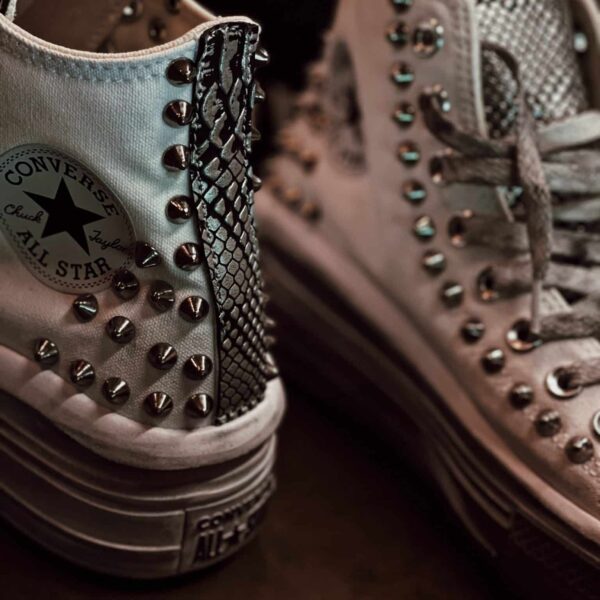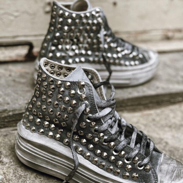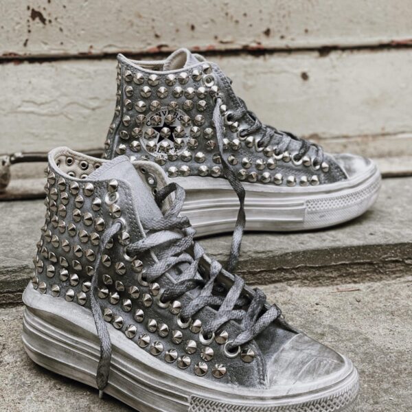 Converse HI PLATFORM MOVE con applicazione di borchie coniche argento sulla tomaia ed effetto used di tomaia, lacci e suola.