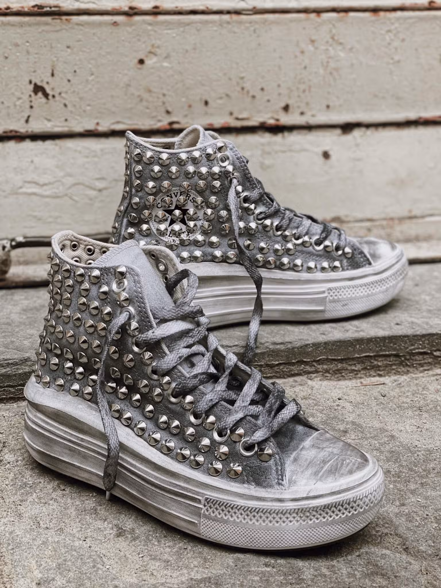 Converse HI PLATFORM MOVE con applicazione di borchie coniche argento sulla tomaia ed effetto used di tomaia, lacci e suola.