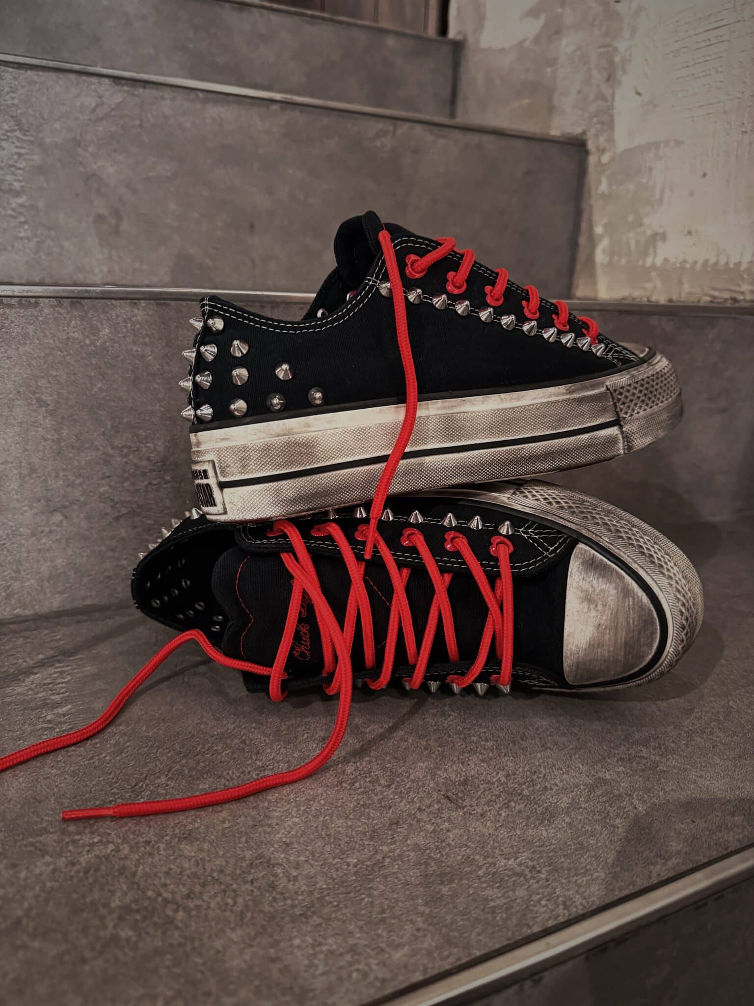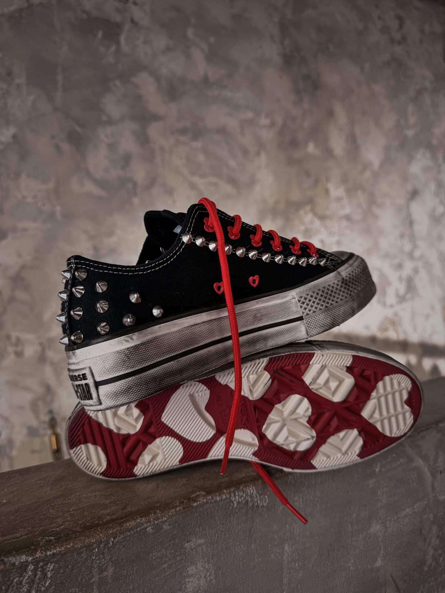 Le borchie spike argentate corrono lungo la tomaia e il tallone, creando un carattere deciso e underground, mentre i cuori presenti negli occhielli passa-lacci raccontano il lato più iconico del design: una sneaker che unisce attitudine e sentimento.