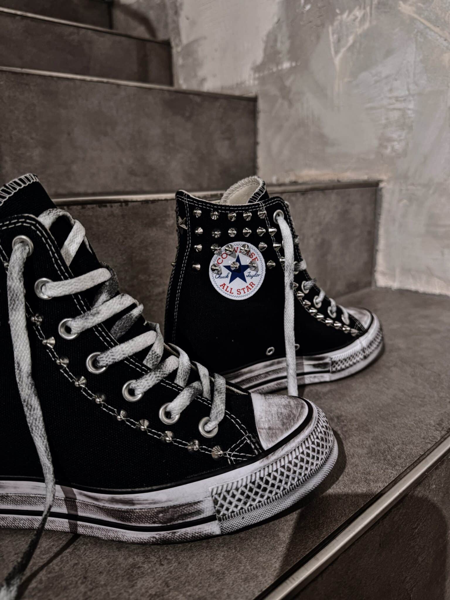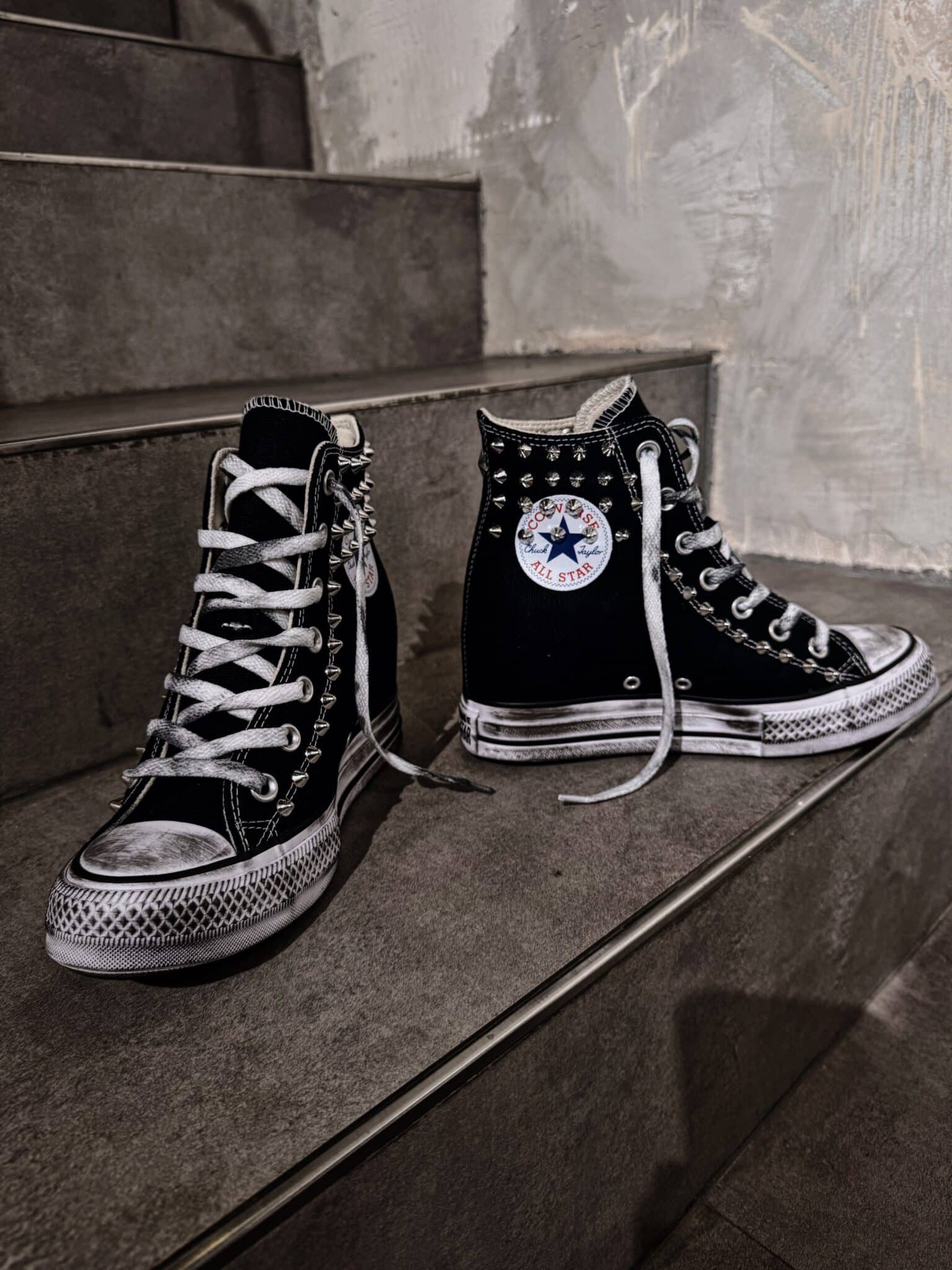 La tomaia decorata con borchie artigianali e l’esclusivo effetto used su suola e lacci trasformano il modello iconico in un must-have dallo spirito grunge e streetwear.