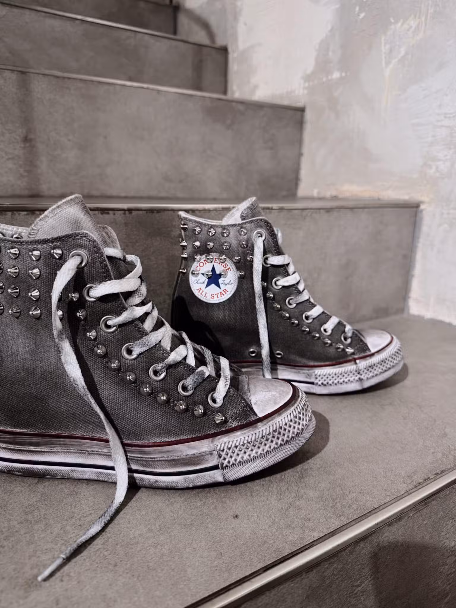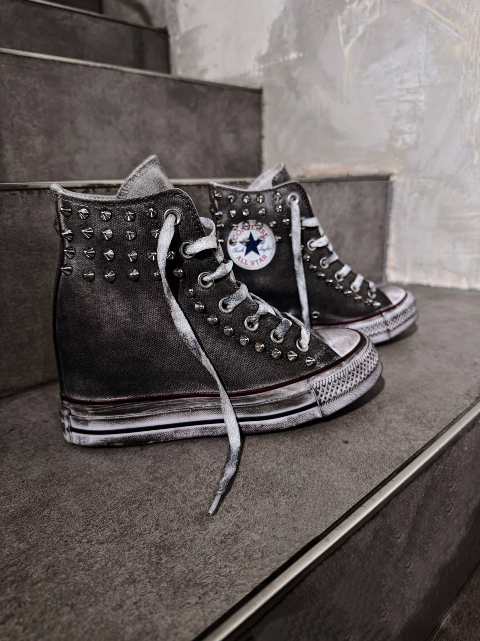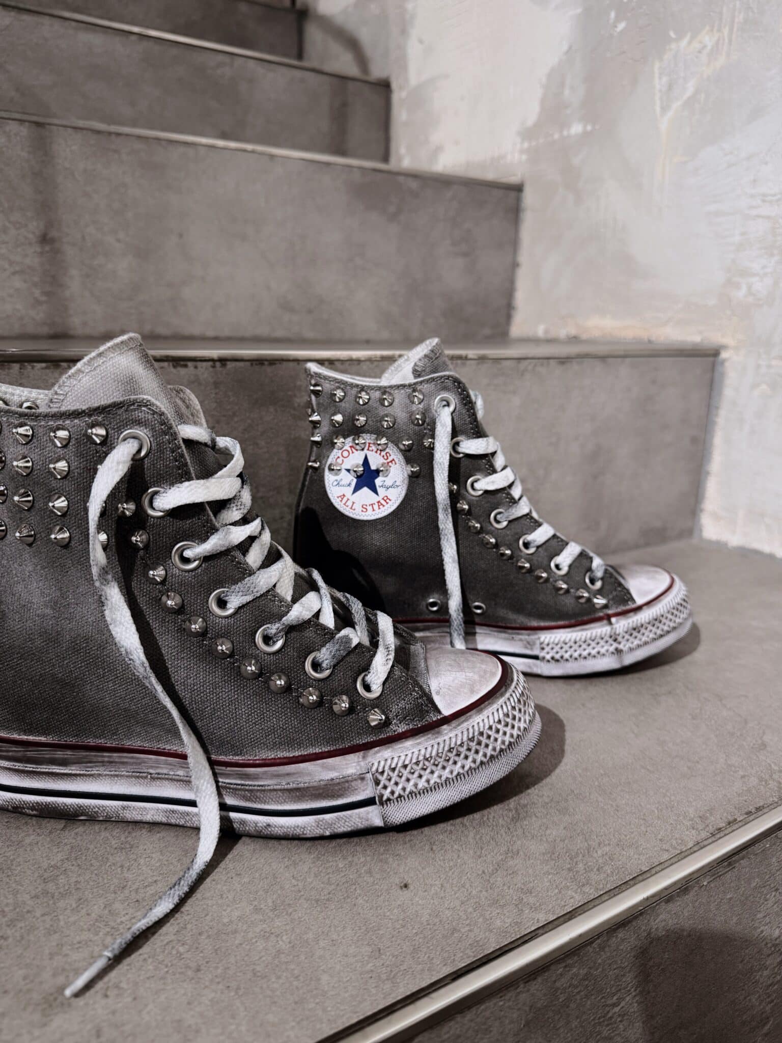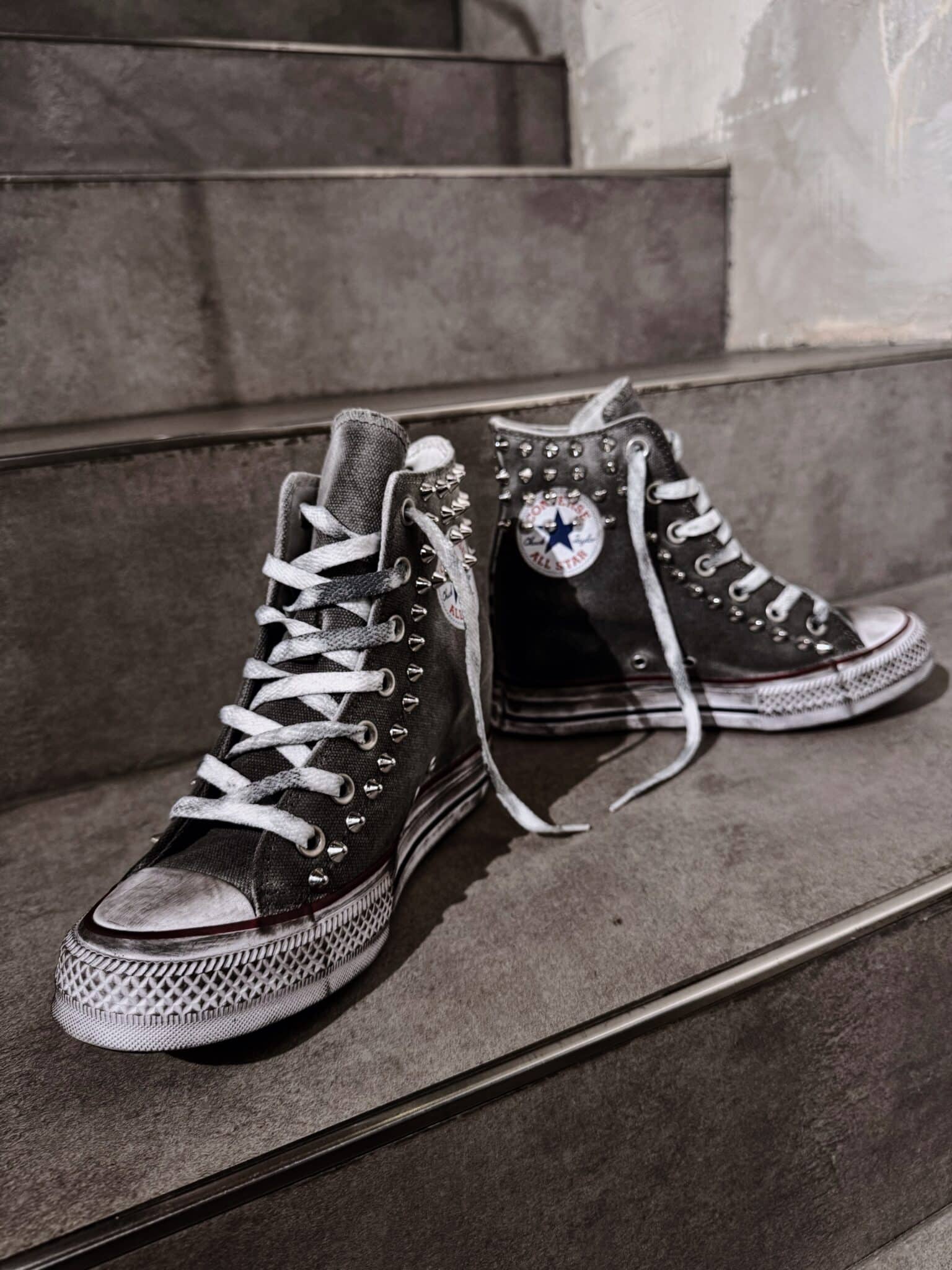La tomaia decorata con borchie artigianali e l’esclusivo effetto used su suola e lacci trasformano il modello iconico in un must-have dallo spirito grunge e streetwear.