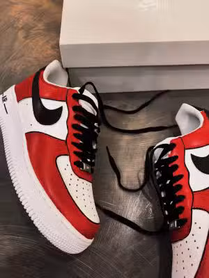 Esalta il tuo stile con Nike modello AIR FORCE low colore bianco dipinta interamente a mano con gli iconici colori Chicago Bulls.