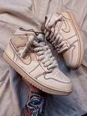 Definisci il tuo cammino con eleganza. NIKE modello AIR JORDAN MID custom con trattamento yellowing e aggiunta di laccio corda. Perfette per ogni avventura urbana.