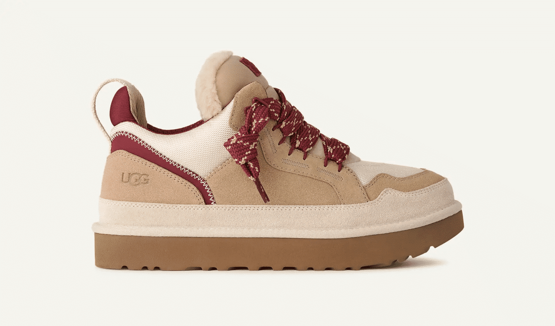 Tomaia in camoscio e tessuto realizzato in fibre di nylon riciclato (100%), cinturino in tessuto resistente sul tallone, applicazione con logo UGG®, collarino imbottito, linguetta oversize imbottita