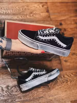 Confort e stile si uniscono. Vans modello OLD SKOOL PLATFORM bassa rifinita con borchie sferiche sulla tomaia ed invecchiatura di suola e lacci. Scopri la collezione esclusiva oggi!
