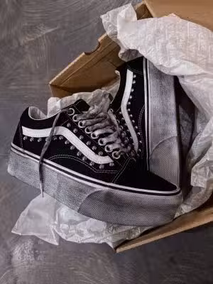 Definisci il tuo cammino con eleganza. Vans modello OLD SKOOL STACKFORM colore nero, suola SUPER PLATFORM, rifinita con borchie sferiche colore argento sulla tomaia ed effetto used di suola e lacci. Perfette per ogni avventura urbana.